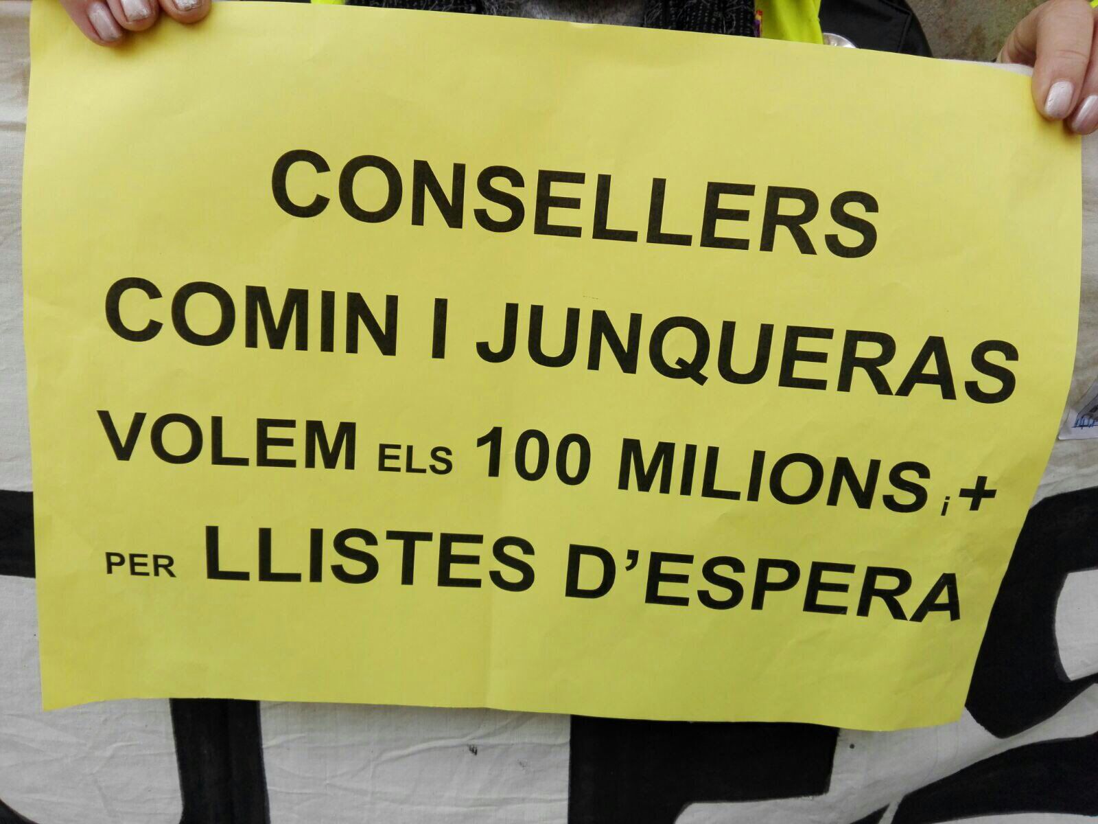Aquests dies han sabut que el pressupost de 96M€ està rebaixat a 56M€. La Marea Blanca va anar al Parlament a parlar amb Comín a dir-li que no hi estaven d’acord. L’acció d’ahir era per fer pressió. «Vicepresidència i Economia sí que tenen capacitat d’organitzat pressupostos; és un tema de govern, no de conselleria, per poder atendre a més pacients», afirma.