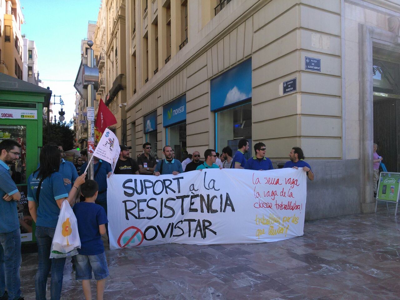 Poc abans que començara la manifestació, un grup de persones, entre elles treballadors i treballadores de Movistar, s’han concentrat a les portes de la botiga que aquesta multinacional té a la plaça del País Valencià. S’hi han cridat consignes a favor de la #resistènciaMovistar i s’ha informat els vianants.