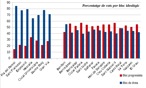 Als barris obrers aquesta dinàmica encara és més acusada, ja que amb un increment de participació electoral major que als barris rics, la pèrdua de vots de la dreta encara és més gran. Com a exemple tenim els casos de Benicalap on, amb un increment del 2% de la participació, l’esquerra guanya 2’5 punts i la dreta en perd 0,9. Al barri de Natzaret, amb un increment també superior a la mitjana de la resta de la ciutat, el 2,3, les dretes en conjunt veuen una disminució de suport encara major, 5,6 que pràcticament recupera en la seua totalitat l’esquerra amb un 4,9 més.