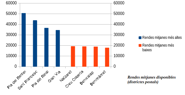 Les dades per plantejar totes tres idees se circumscriuen a la ciutat de València, per a la qual cosa hem utilitzat els resultats de les eleccions estatals de 2019 i les dades de la renda mitjana disponible per codis postals (b). A les eleccions al Congreso Vox va obtenir un 2,08% més que a les autonòmiques. D’aquesta manera, les de les Generals, resulten xifres més fidedignes per conèixer el seu votant potencial. Les dades que aporta l’Agència Tributària, són les més exactes i fiables de què disposem, pel que fa als índex de la renda dels votants.