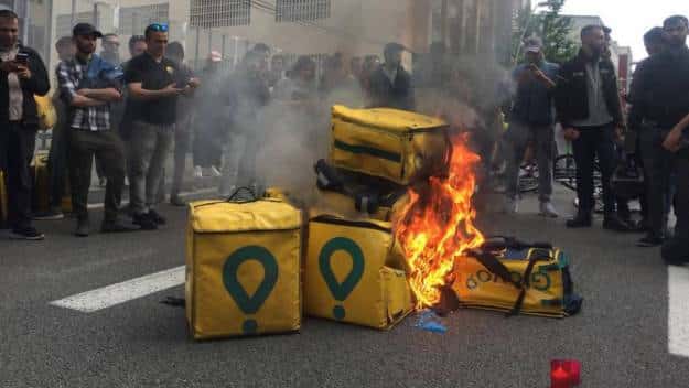 En aquest sentit, el fort component simbòlic de les plataformes de lliurament d’aliments, que és un dels eixos clau del model de negoci a través del qual obtenen beneficis, ha proporcionat als missatgers una forta arma que podrien utilitzar al seu favor. De fet, multinacionals de repartiment d’aliments com Deliveroo, Foodora i Glovo intenten obtenir beneficis també projectant una imatge de pràctiques comercials fresques, “agradables” i respectuoses amb el medi ambient, gràcies al fet que els seus treballadors operen en bicicleta (encara que a molts països, aquesta imatge realment amaga una realitat més complexa on els missatgers de motocicletes són igual de centrals per al negoci). Tenint en compte això, la capacitat de les mobilitzacions recents per desemmascarar aquesta imatge mitjançant estratègies comunicatives disruptives pot fer que les empreses siguin molt més vulnerables, tant en el sentit econòmic com en el polític. Com s’ha suggerit recentment, en temps del capitalisme digital, aprofitant un atac contra un component aparentment ‘simbòlic’ d’un negoci –com ara la imatge pública de la plataforma– es pot convertir en un element clau per colpejar la cadena de valor allà on fa mal[22].