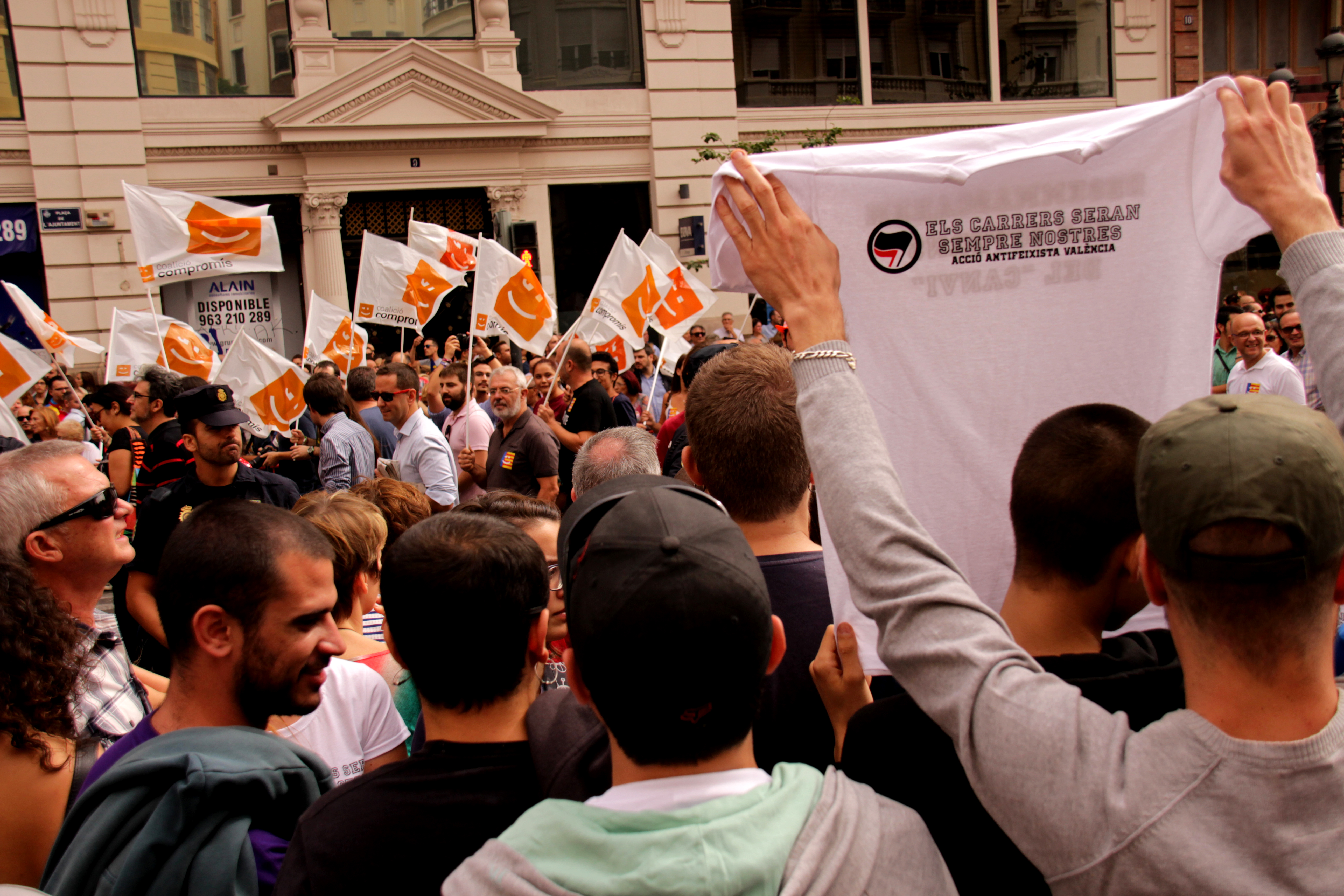 La convocatòria antifeixista del matí era el segon any que es feia i la policia espanyola ja l’esperava. A algunes manifestants els van escorcollar les motxilles només per qüestions estètiques: ningú duia cap pancarta. Les ‘pancartes’ serien les samarretes que les antifeixistes duien i que mostrarien al pas dels diversos grups feixistes que circulen amb total normalitat i impunitat encara ara en la València del canvi.