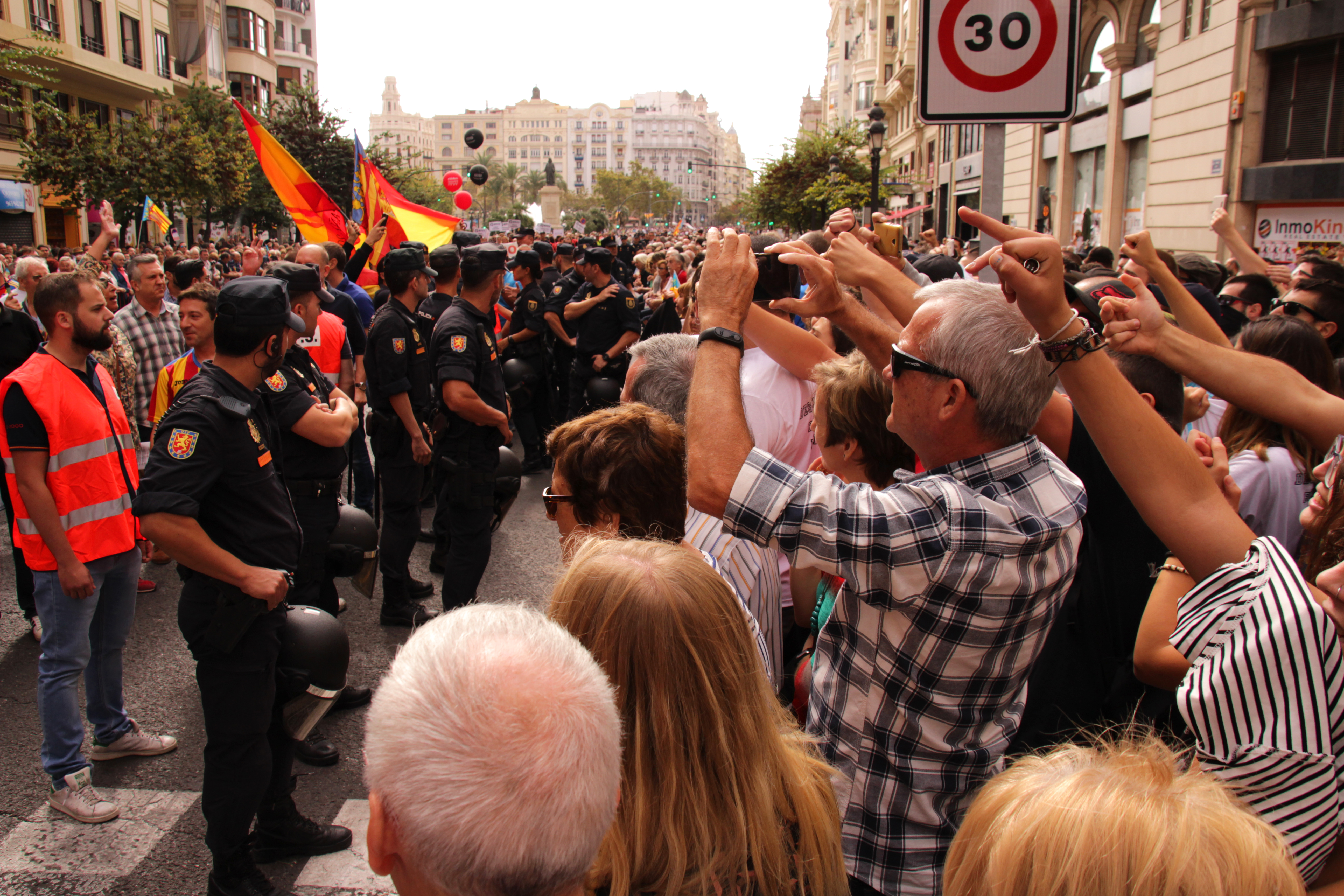 Les antifeixistes van aplaudir i donar suport al pas de les comitives de la Jove Muixeranga d’Algemesí o de la plantilla de RTVV. Un cop desconvocada la mobilització, la plaça del Pilar, al costat del Racó de la Corbella, va aplegar un dinar popular solidari amb la plantilla en lluita d’Esfosa, a Vic. No debades, el dia abans, el Casal Obrer i Popular Francesc Santacatalina n’havia acollit un acte de suport, organitzat per la COS.
