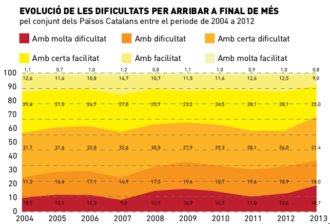 Amb la crisi, aquest empobriment de les classes populars s’ha fet encara més evident. Si la situació general als Països Catalans ja es pot considerar d’alarma social, la situació concreta del País Valencià és dins el conjunt la més crua pel que fa a les dades d’atur. 26% d’atur i 57,8% d’atur juvenil són xifres que demostren el resultat. En aquests anys de crisi, més de 230.000 treballadors han estat afectats per un ERO -gairebé 740.000 a tots els Països Catalans-.