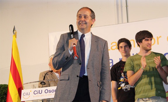 Felip Puig, conseller d’interior que va ordenar el desallotjament de la Plaça Catalunya, molt satisfet amb un bat que li va regalar la JNC per celebrar la seva actuació.