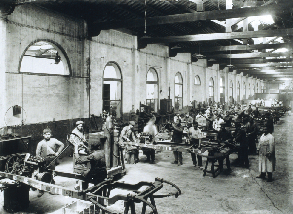 Treballadors de la fàbrica de la Hispano Suiza a la carretera de Ribes de Barcelona. Anys 1910s.