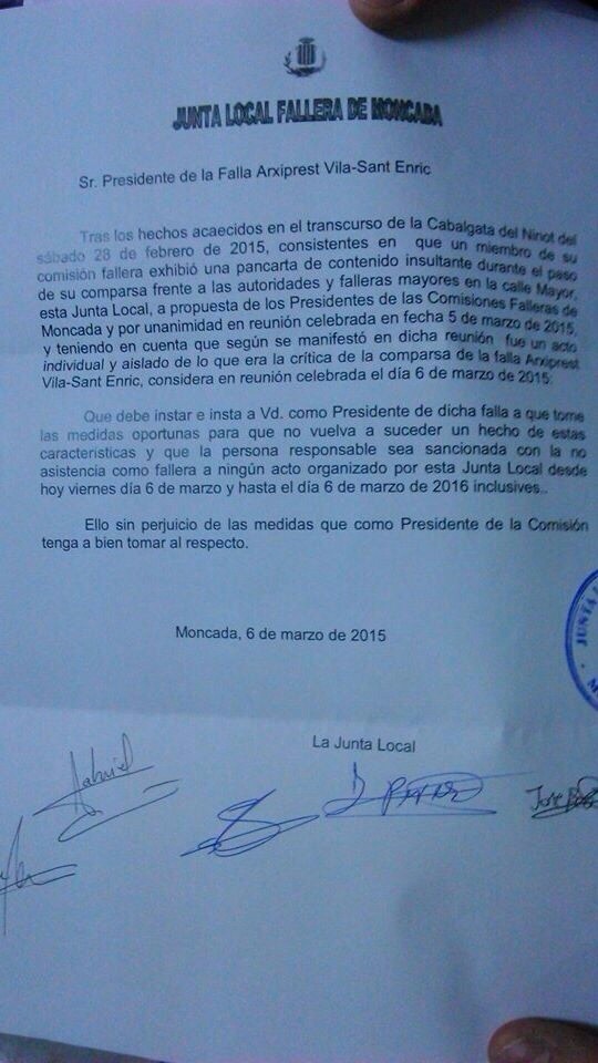 Com a conseqüència d’aquesta crítica, la JLF ha decidit sancionar-me amb un any d’inhabilitació (6 de març de 2015 fins 6 de març de 2016) en la festa fallera. No podré participar a cap acte organitzat per la JLF. Aquesta sanció ve promoguda per dos presidents fallers amb el consentiment dels altres 6 restants. […] A mi no m’han donat oportunitat d’explicar la pancarta ni justificar el per què d’ella.